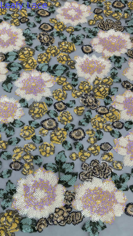 Vải thêu mỏng với các mô hình lá tinh tế là một lựa chọn phổ biến cho váy cưới và tiệc tùng, cung cấp sự thanh lịch, kết cấu và chi tiết phức tạp.Công nghệ đằng sau sản xuất của nó liên quan đến sự pha trộn của nghề thủ công truyền thống và các đổi mới dệt may hiện đại.